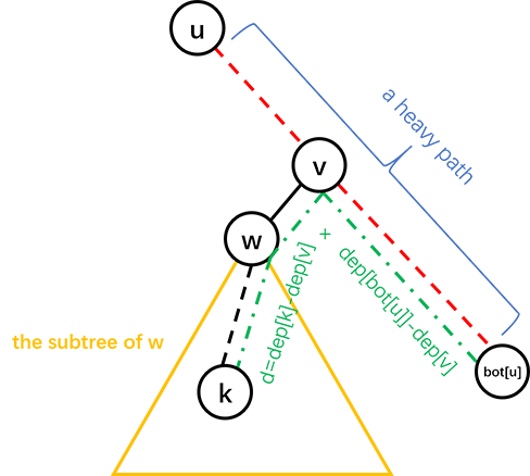 根据长链剖分的性质, k-2^i < 2^i \leq d , 也就是说,我们可以 O(1) 在这条长链的表格上求出的这个节点的 k 级祖先。
