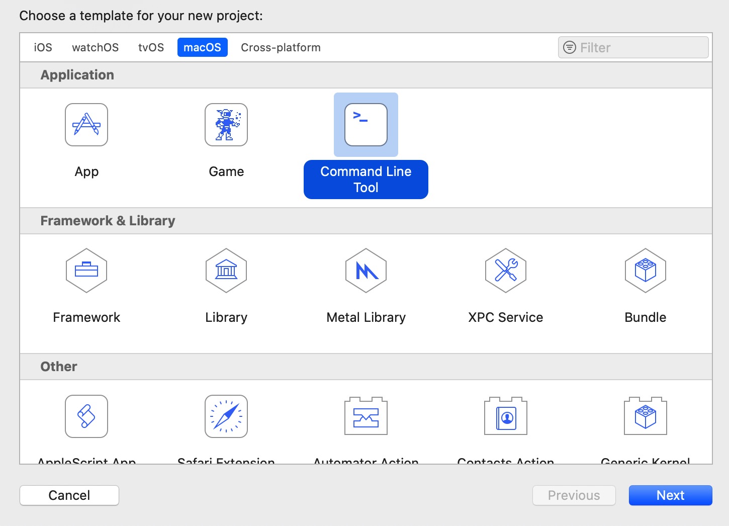 点击 Create a new Xcode project(创建一个新的 Xcode 项目),然后选择上方 macOS 中的 Command Line Tool(命令行工具),并点击右下角的 Next。